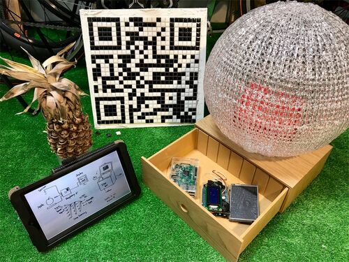 English follows japanese センサモジュールとラズパイとタブレットを置いて、ペンとパイナップルとリンゴをたくさん並べる。自分はヒョウ柄とサングラスも着るかもしれない。もちろんQRコードタイルも展示するつもりだ。 来てくれた人にリンゴやパイナップ…